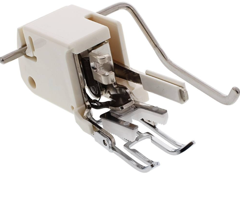 The Even Feed Foot, sometimes referred to as the walking foot, is designed with a set of feed dogs that allow the fabric to feed without shirting and eliminate the problem of the underlayer of fabric coming up short. The Even Feed Foot is also great for topstitching, which can be spoiled due to the irregularity of stitching. This is often caused by the bulk created with the seam allowance, especially around collars and sleeves. Using the walking foot for topstitching will eliminate this problem and give perfect stitching every time.
