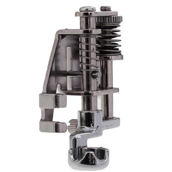 The 1/4” Ruler Foot was specifically designed to be used for ruler work using Janome quilting rulers. The 1/4” cup height moves smoothly alongside the quilting ruler without allowing the ruler to slide over or under. With this foot, the needle drops a 1/4 inch away from the ruler to create the quilting line. Please note this foot is to be used with 7mm width low shank top-loading models.
