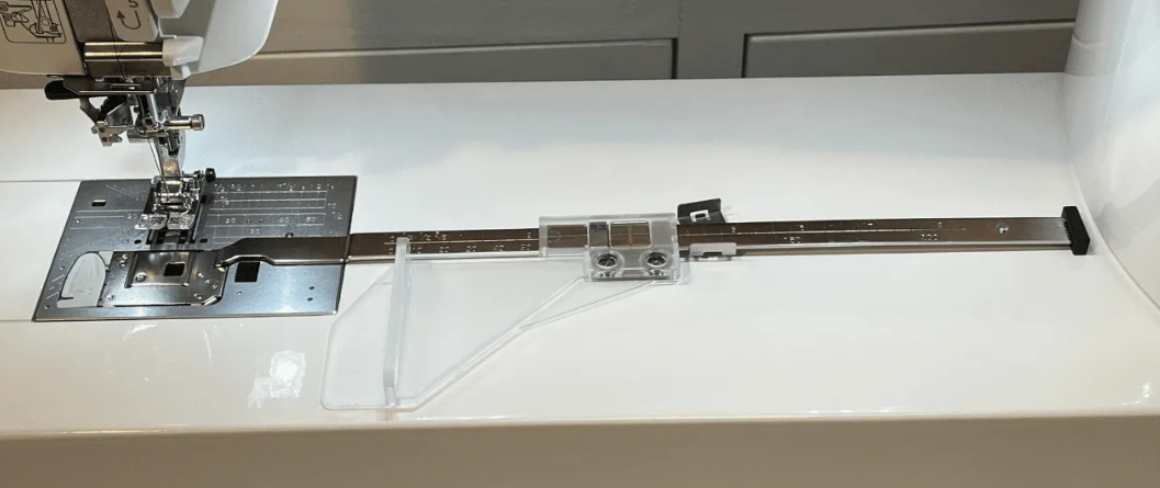 The Cloth Guide features an easy-to-use snap-in design. This guide works with the hook cover plate located on the top of the M7 sewing bed. To use just remove the plastic see-through hook cover plate, align the Cloth Guide with the tabs, and snap it in place. The guide creates a rigid and reliable surface for aligning your fabric as you sew. It’s just that easy! Just snap the guide in, set your measurement on the bar, and sew! No need to measure or mark your fabric.